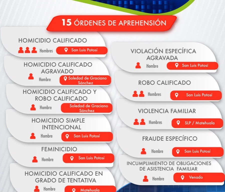 Aparte de las 7 órdenes cumplimentadas por homicidio y feminicidio, se aprehendió a un sujeto por el delito de violación específica agravada; dos por violencia familiar, que es el ilícito con más incidencia en el Estado; y una más por incumplimiento de obligaciones familiares.