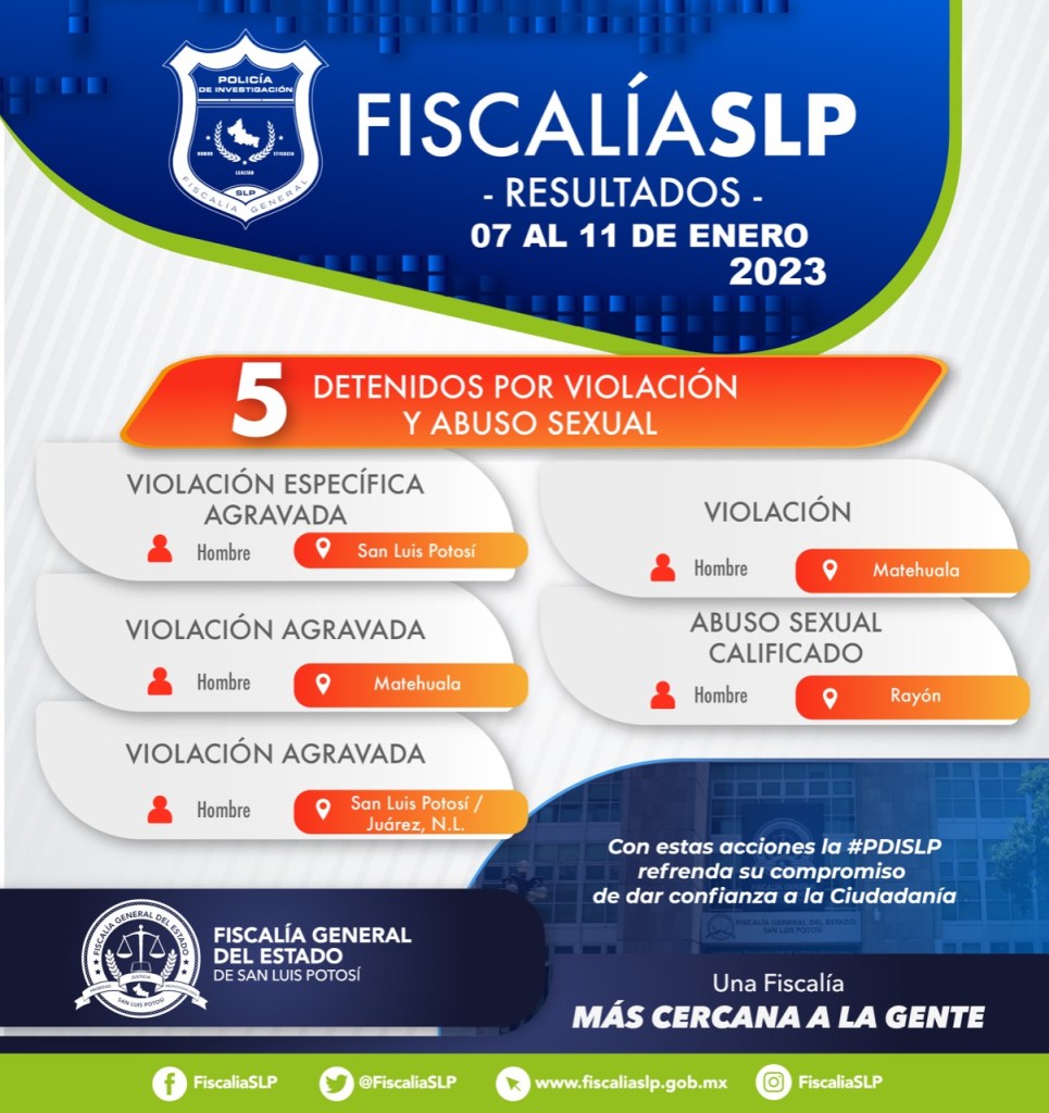 Tras el seguimiento e integración de diversas carpetas de investigación por agresiones sexuales, en los primeros días de enero, la Fiscalía General del Estado (FGE) logró la aprehensión de cinco personas por esos delitos cometidos en San Luis Potosí.