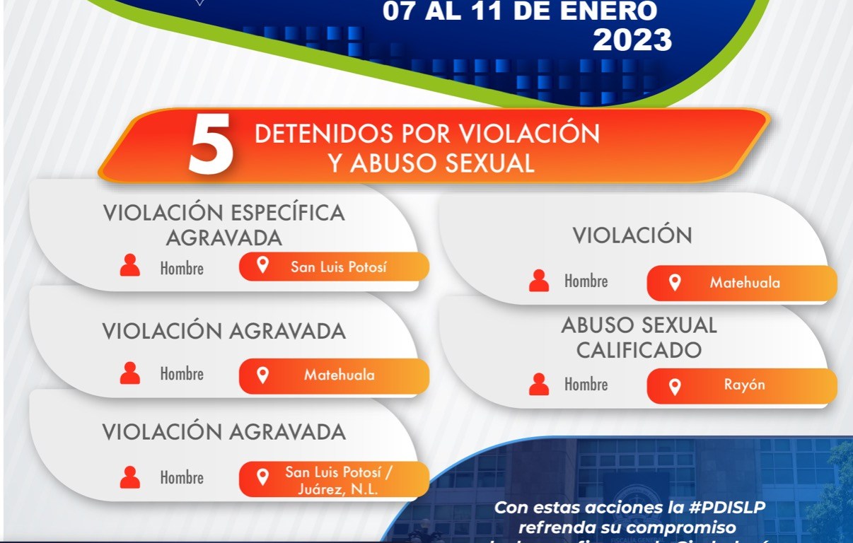 Tras el seguimiento e integración de diversas carpetas de investigación por agresiones sexuales, en los primeros días de enero, la Fiscalía General del Estado (FGE) logró la aprehensión de cinco personas por esos delitos cometidos en San Luis Potosí.