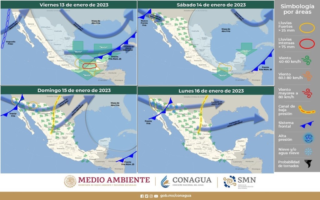 En cuanto al pronóstico para el fin de semana se espera que, el frente frío Núm. 23 se desplazará hacia el Mar Caribe, dejando de afectar al territorio mexicano. Sin embargo, la masa de aire frío asociada al frente mantendrá el evento de “Norte” muy fuerte en el Istmo y Golfo de Tehuantepec, así como bajas temperaturas sobre entidades del norte, noreste, oriente, centro y sureste del país, con heladas al amanecer en zonas altas, condiciones que comenzarán a disminuir paulatinamente durante el día lunes.