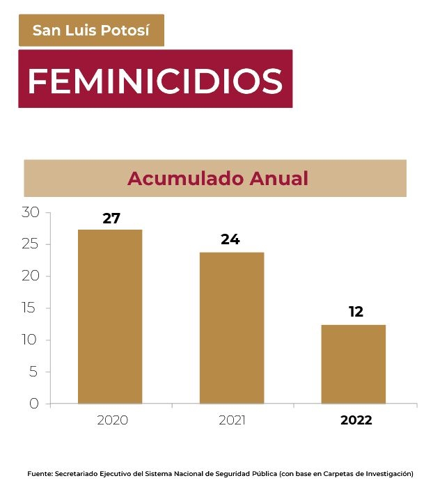 Igualmente, González Castillo se refirió a la ocurrencia de feminicidios en la Entidad potosina: de 27 crímenes cometidos en el año 2020, la cifra se redujo a 12 en el año 2022, lo cual significa una baja del 55 por ciento. En el delito de trata de personas, de 17 casos en el 2020, disminuyó un 41 por ciento en 2022, con 10 casos.