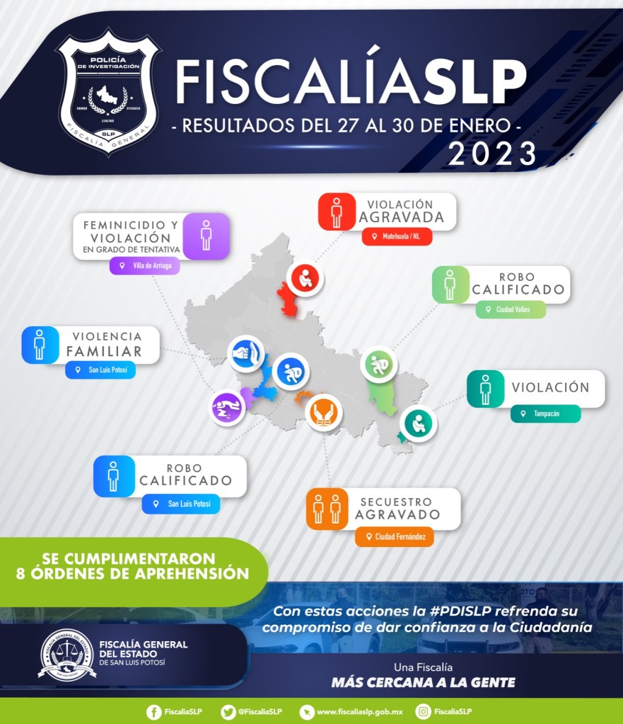 La Fiscalía General del Estado (FGE) informó que en recientes días, la Policía de Investigación (PDI) ejecutó mandamientos judiciales a ocho personas que estarían vinculadas a hechos delictivos cometidos en San Luis Potosí.
