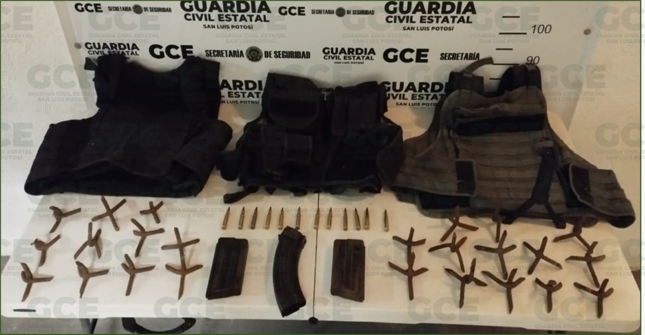 En el marco de las acciones dispuestas en el Plan Integral de Seguridad cuyo objetivo es inhibir actos que pongan en riesgo la integridad de las familias potosinas, la Guardia Civil Estatal (GCE) realizó el hallazgo de un automotor en el cual aseguraron equipo táctico, cartuchos de diferentes calibres y objetos conocidos como “poncha llantas”.