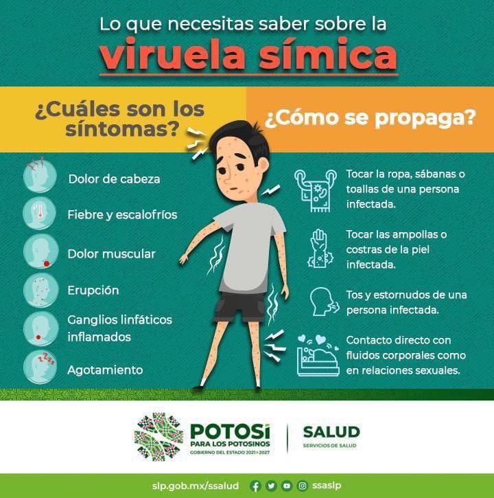 Los síntomas que caracterizan la enfermedad, indicó, pueden iniciar entre cinco a 21 días posteriores al contacto con el virus y pueden ser, fiebre, dolor de cabeza, agotamiento, dolores musculares, inflamación de los ganglios linfáticos, manifestándose en áreas del cuello, axilas, región inguinal, entre otras; lesiones en la piel, en forma de erupciones que se caracterizan por evolucionar de ser planas a hacerse elevadas, llenarse de agua y por último, costras que suelen aparecer primero en cara y manos para después extenderse al resto del cuerpo, pero también pueden aparecer inicialmente en los genitales o en otras partes del cuerpo.