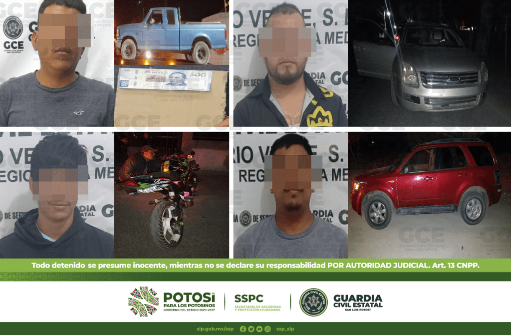 Derivado de los diferentes operativos de seguridad y vigilancia encaminados a preservar la paz pública en el Estado potosino, oficiales de la Guardia Civil Estatal (GCE) detuvieron a cuatro masculinos por presuntos delitos contra la seguridad de tránsito.