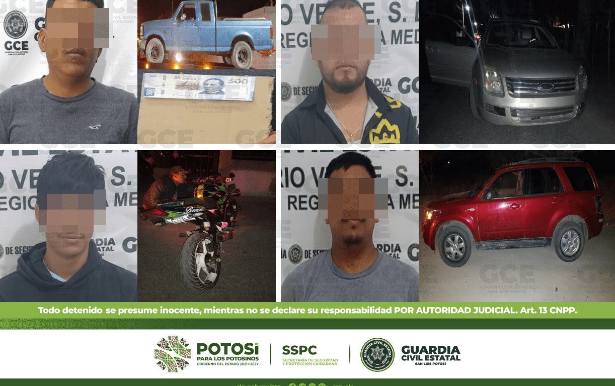 Derivado de los diferentes operativos de seguridad y vigilancia encaminados a preservar la paz pública en el Estado potosino, oficiales de la Guardia Civil Estatal (GCE) detuvieron a cuatro masculinos por presuntos delitos contra la seguridad de tránsito.
