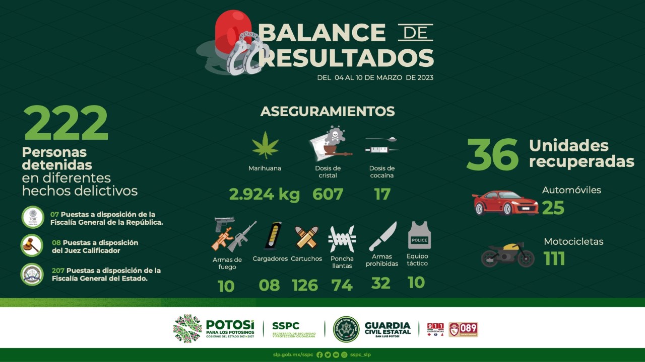 En el periodo correspondiente del 04 al 10 de marzo del presente año, 7 personas fueron detenidas y puestas a disposición de la Fiscalía General de la República; 207 quedaron a disposición de la Fiscalía General del Estado y 8 más al Juez Cívico Calificador por faltas administrativas.