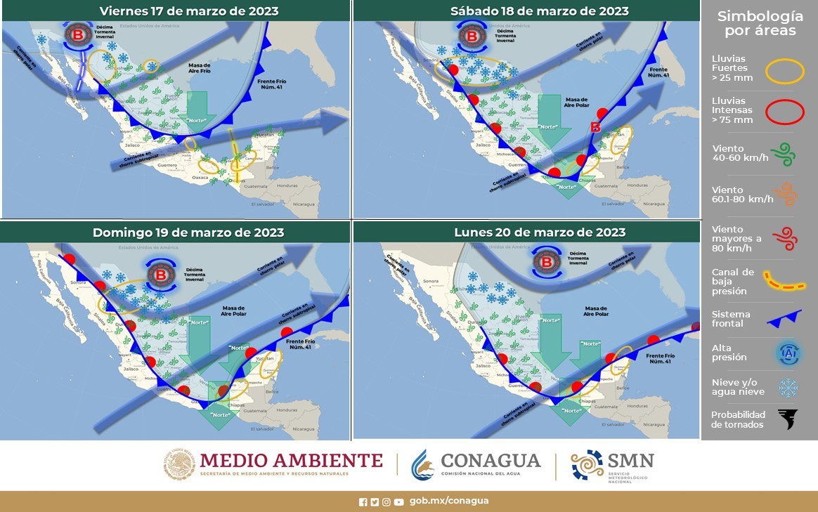 En cuanto al pronóstico para el fin de semana se espera que, una masa de aire polar ártico reforzará al frente No. 41, el cual se extenderá con características de estacionario sobre el norte, centro y sureste de la República Mexicana, mientras que la décima tormenta invernal de la temporada se desplazará lentamente sobre la frontera norte del territorio nacional, estos sistemas aunados al ingreso de humedad generado por las corrientes en chorro polar y subtropical generarán chubascos y lluvias fuertes sobre el noroeste, norte, noreste, oriente y sureste del país, además de la Península de Yucatán, probabilidad para la caída de nieve o aguanieve en la sierras de Sonora, Chihuahua, Durango, Coahuila y Nuevo León.