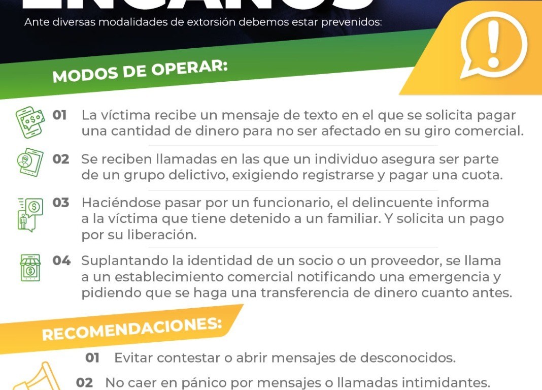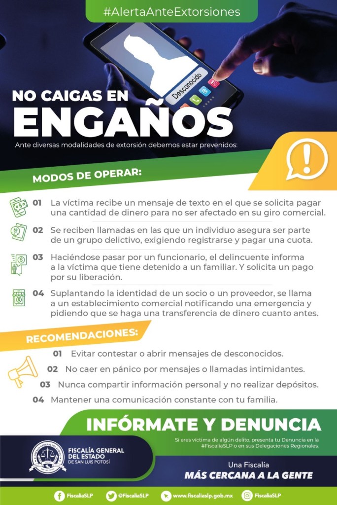 La Fiscalía General del Estado (FGE) alerta a la ciudadanía a no caer en llamadas de extorsión, y recomienda no proporcionar datos personales o información que puedan ocupar los delincuentes para generar situaciones de supuestos secuestros y otros engaños.