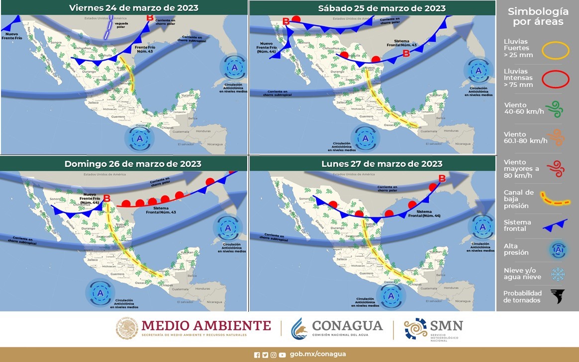 Durante el periodo de pronóstico, el Frente Frío No. 44 se desplazará sobre el noroeste, norte y noreste del territorio nacional, en interacción con las corrientes en chorro polar y subtropical ocasionará vientos fuertes en dichas regiones, además de mantener el potencial de lluvias y chubascos con descargas eléctricas en Coahuila, Nuevo León y Tamaulipas.