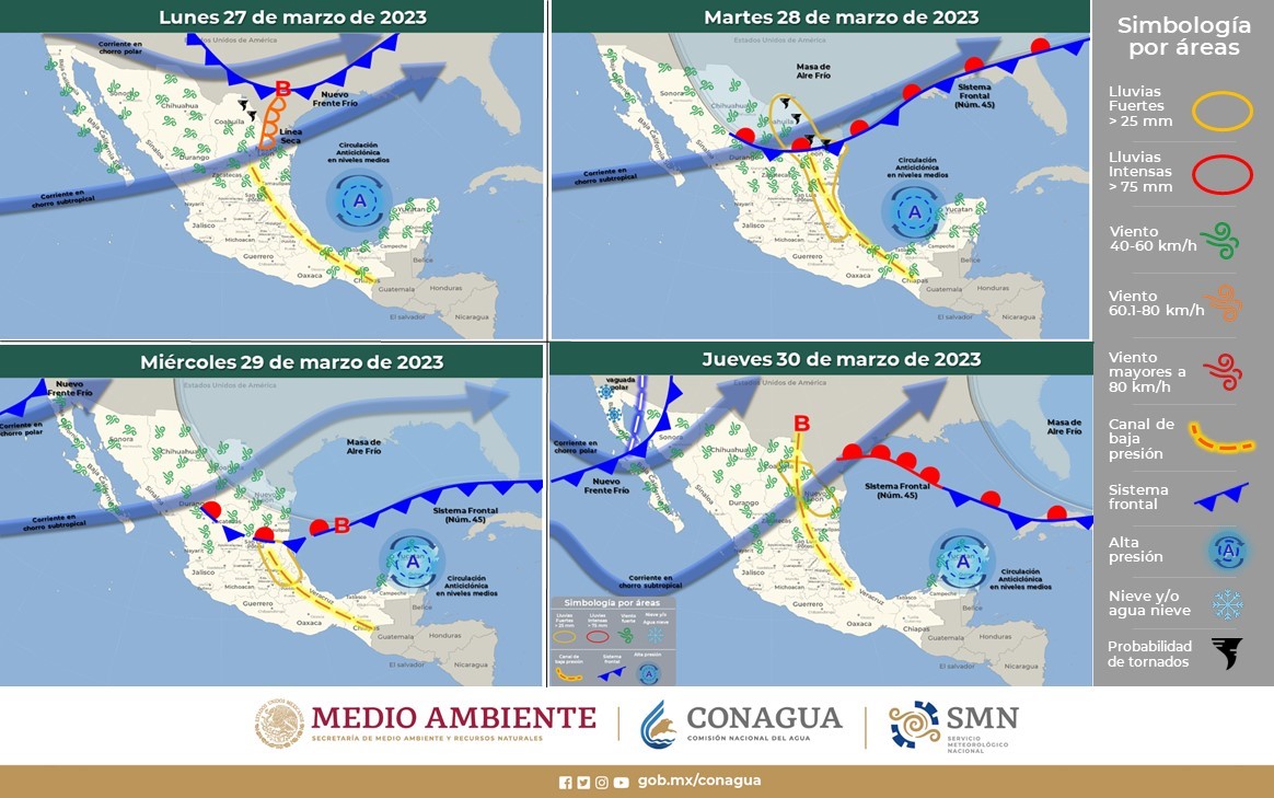 En cuanto al pronóstico para la semana, se espera que, durante el martes y miércoles, un nuevo frío (No. 45) y su masa de aire frío asociada se extenderán sobre el norte y noreste de la República Mexicana, en interacción con la corriente en chorro subtropical, ocasionarán un marcado descenso de las temperaturas diurnas e incremento en el potencial de vientos fuertes con tolvaneras en el norte y noreste del país; así como lluvias fuertes a muy fuertes con descargas eléctricas, granizadas y probabilidad para la formación de torbellinos o tornados en zonas de Coahuila, Nuevo León y Tamaulipas.