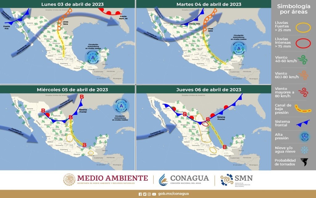 En cuanto al pronóstico para la semana, se espera que, el día martes, el nuevo frente frío recorrerá el noroeste y norte del país, interaccionará con una línea seca que se extenderá sobre el noreste de la República Mexicana y con las corrientes en chorro polar y subtropical, ocasionando fuertes rachas de viento en las mencionadas regiones, así como lluvias aisladas en Nuevo León y Tamaulipas. Por otra parte, un canal de baja presión y el ingreso de humedad del Golfo de México, originarán lluvias y chubascos en el centro, oriente y sureste del territorio nacional.