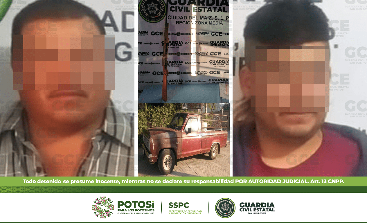 – Tras las acciones operativas y encaminadas a generar ambientes de paz para todas y todos los potosinos, dos hombres resultaron detenidos por la Guardia Civil Estatal, tras los recorridos de seguridad en la localidad Pendencia y asegurarles un rifle.