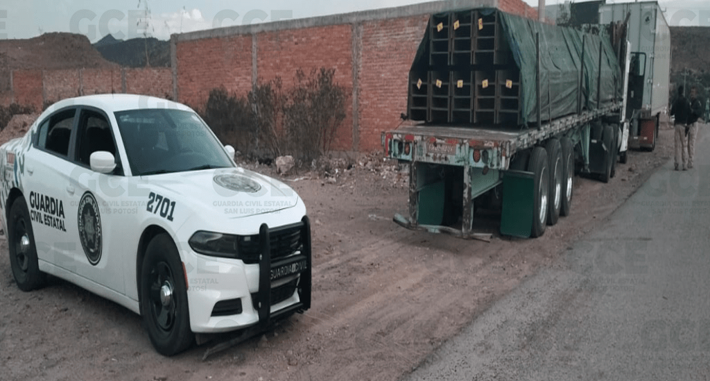 El aseguramiento se dio luego de que el Centro de Control, Comando, Comunicaciones y Cómputo (C-4) alertó a los oficiales estatales sobre el robo de un tractocamión marca Volvo, modelo 2008, color verde, con placas del Servicio Público Federal, mismo que estaba acoplado a un semirremolque tipo plataforma, marca Fruehauf modelo 2007, cargado con vigas de acero.