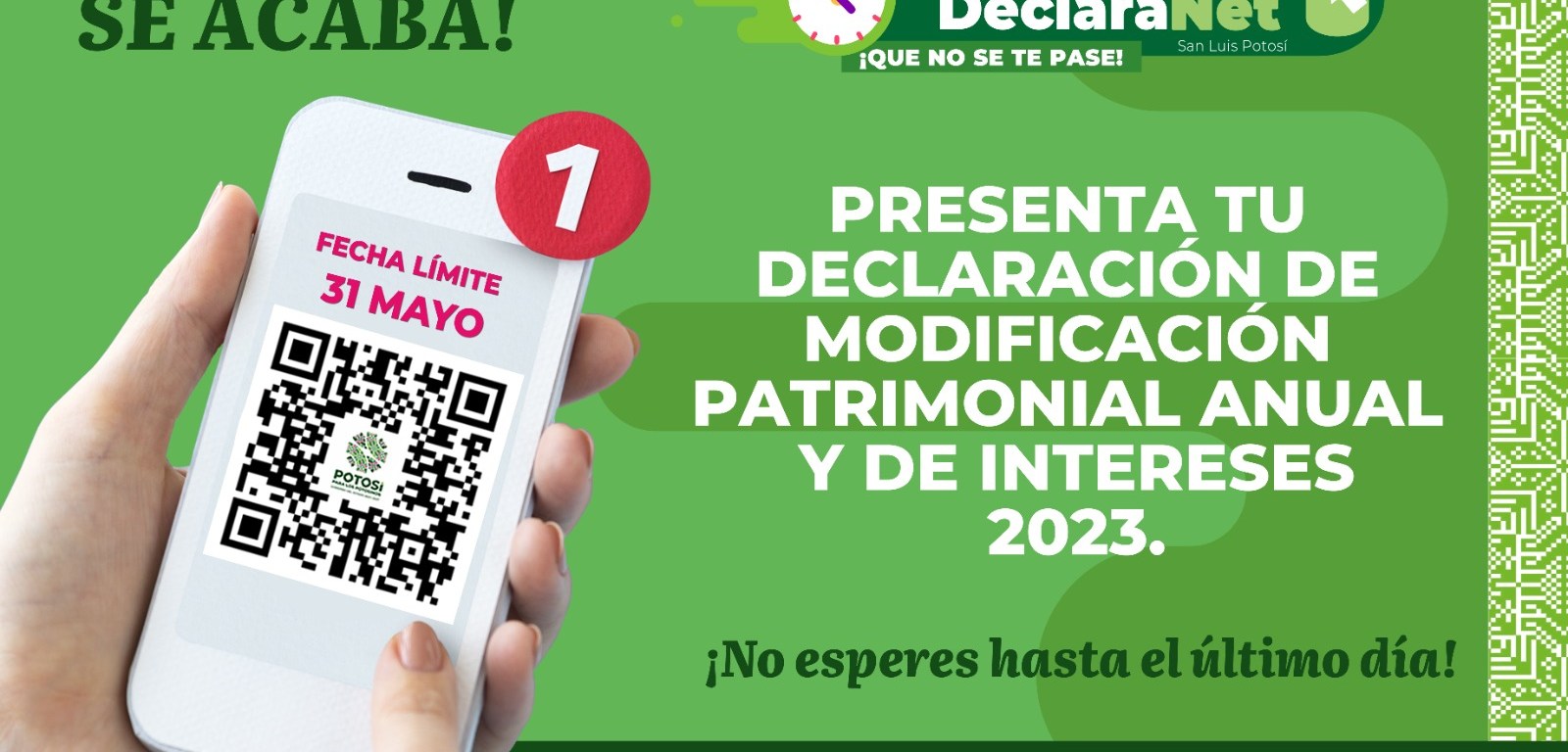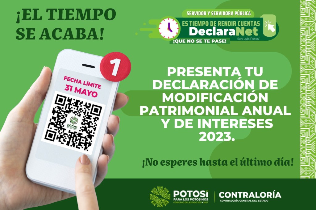 La Contraloría General del Estado, hace un llamado a las y los funcionarios estatales obligados a presentar su Declaración de Modificación Patrimonial y de Intereses 2023, a la brevedad posible, ya que la fecha límite es el 31 de mayo.