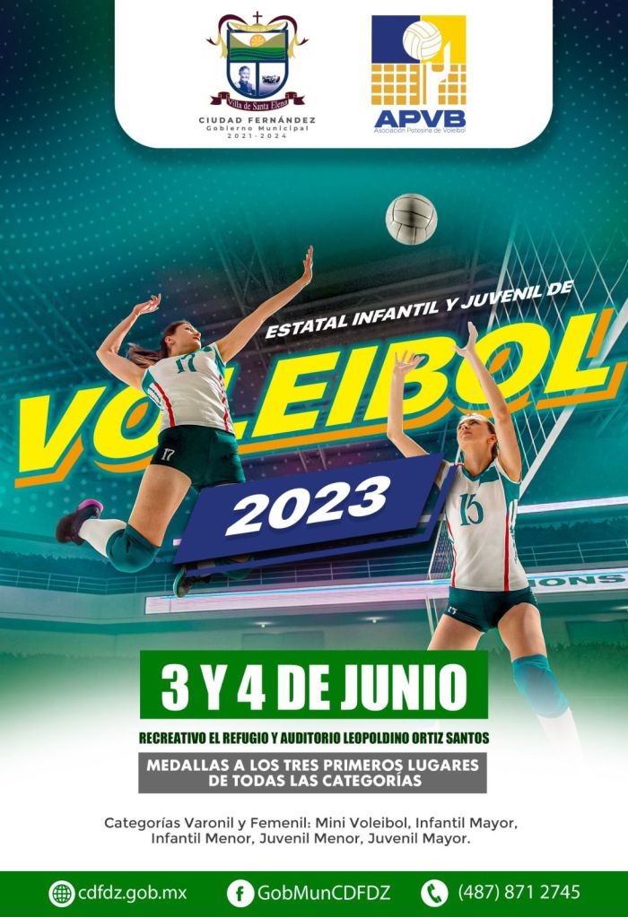 La Asociación Potosina de Voleibol A.C. en coordinación con el Gobierno Municipal de Ciudad Fernández a través del Departamento de Deportes, estarán llevando a cabo durante el 3 y 4 de junio de 2023 el evento deportivo “Estatal Infantil y Juvenil de Voleibol 2023”, mismo que se efectuara en las instalaciones del Recreativo de El Refugio y el Auditorio “Leopoldino Ortiz Santos”.