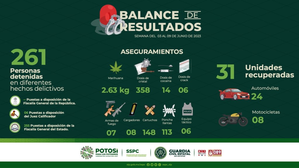 S.L.P.- Resultado de las acciones desplegadas en el Plan Integral de Seguridad para garantizar la paz y la tranquilidad en los 58 municipios de San Luis Potosí, la Secretaría de Seguridad y Protección Ciudadana del Estado (SSPCE), informa que en el periodo comprendido del 3 al 9 de junio del año en curso, un total de 261 personas fueron remitidas a las autoridades.