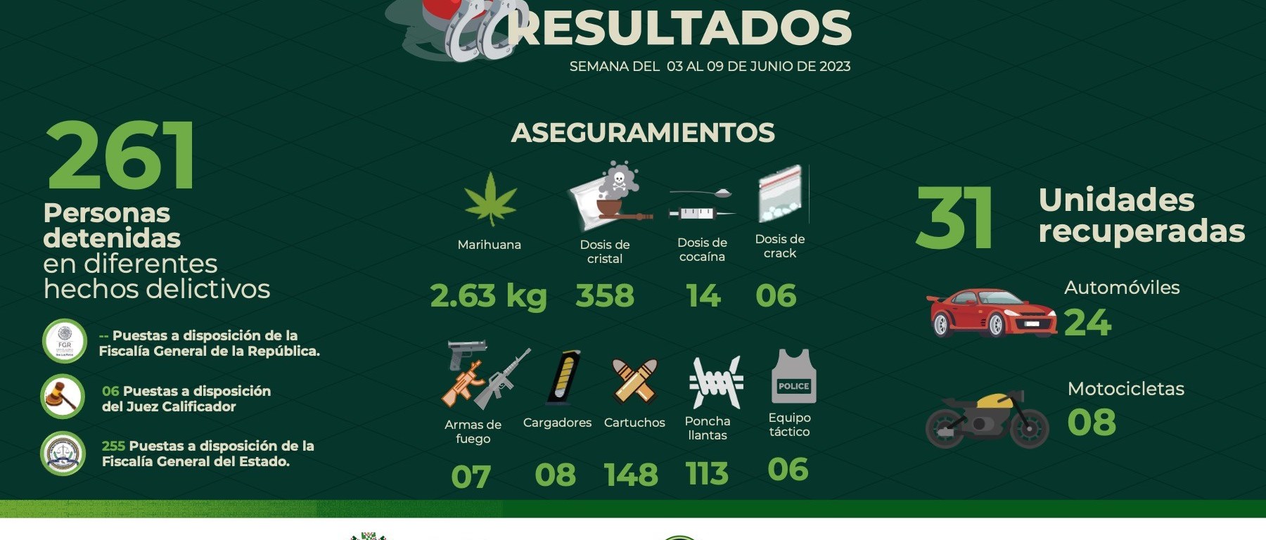 255 de ellos quedaron disposición de la Fiscalía General del Estado y 6 más ante el Juez Cívico Calificador por faltas administrativas, resaltando que entre estas detenciones se encuentran presumibles miembros de células criminales generadoras de violencia en la Entidad.