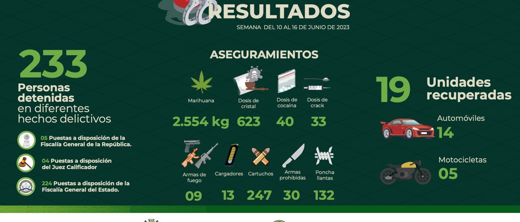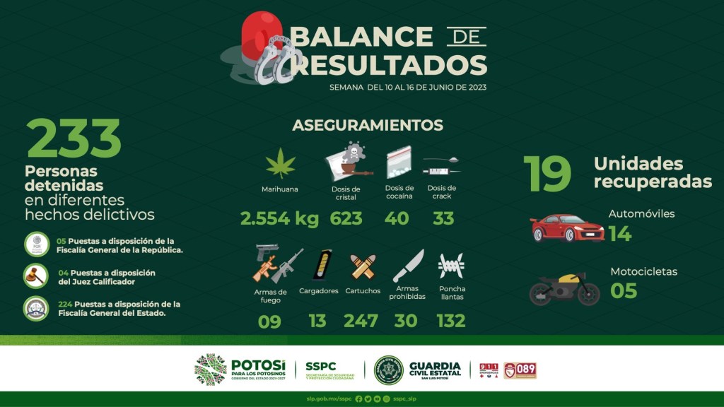 S.L.P.- Como parte de los resultados obtenidos en el combate a la delincuencia, objetivo principal del Gobierno del Cambio para mantener la paz y tranquilidad en los 58 municipios, la Secretaría de Seguridad y Protección Ciudadana del Estado (SSPCE) informa los resultados obtenidos en el periodo comprendido del 10 al 16 de junio del año en curso, siendo detenidas 233 personas en el Estado, por la presunta comisión de actos delictivos.