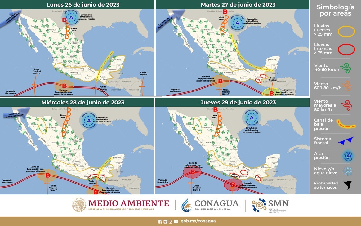 Este día, la Onda Tropical No. 7 al sur de Chiapas; un canal de baja presión en el sureste del país; el ingreso de humedad del Océano Pacífico, Golfo de México y Mar Caribe y una zona de baja presión con probabilidad para desarrollo ciclónico, que se localizará al sur de Guerrero y Michoacán, originarán lluvias puntuales intensas en Michoacán, Guerrero y Oaxaca; muy fuertes en Jalisco, Colima, Chiapas, Campeche y Yucatán, así como lluvias puntuales fuertes en el Estado de México, Ciudad de México, Morelos, Puebla, Veracruz, Tabasco y Quintana Roo; las lluvias mencionadas se acompañaran con descargas eléctricas y posible caída de granizo y podrían generar encharcamientos e incrementar los niveles de ríos y arroyos, así como ocasionar deslaves e inundaciones. También se prevén chubascos en el centro y oriente del territorio nacional.