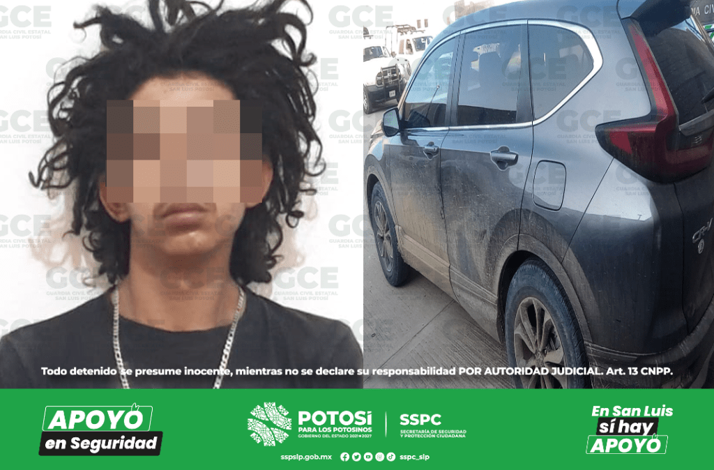 Oficiales de la Guardia Civil Estatal (GCE) detuvieron a Juan de 23 años de edad y a un joven de 17 años en la calle de Mariano Matamoros, tras ser sorprendidos en un vehículo Honda, línea CR-V, color gris, el cual coincidía con una unidad reportada el día 09 de julio de 2023, del municipio de Tamasopo.