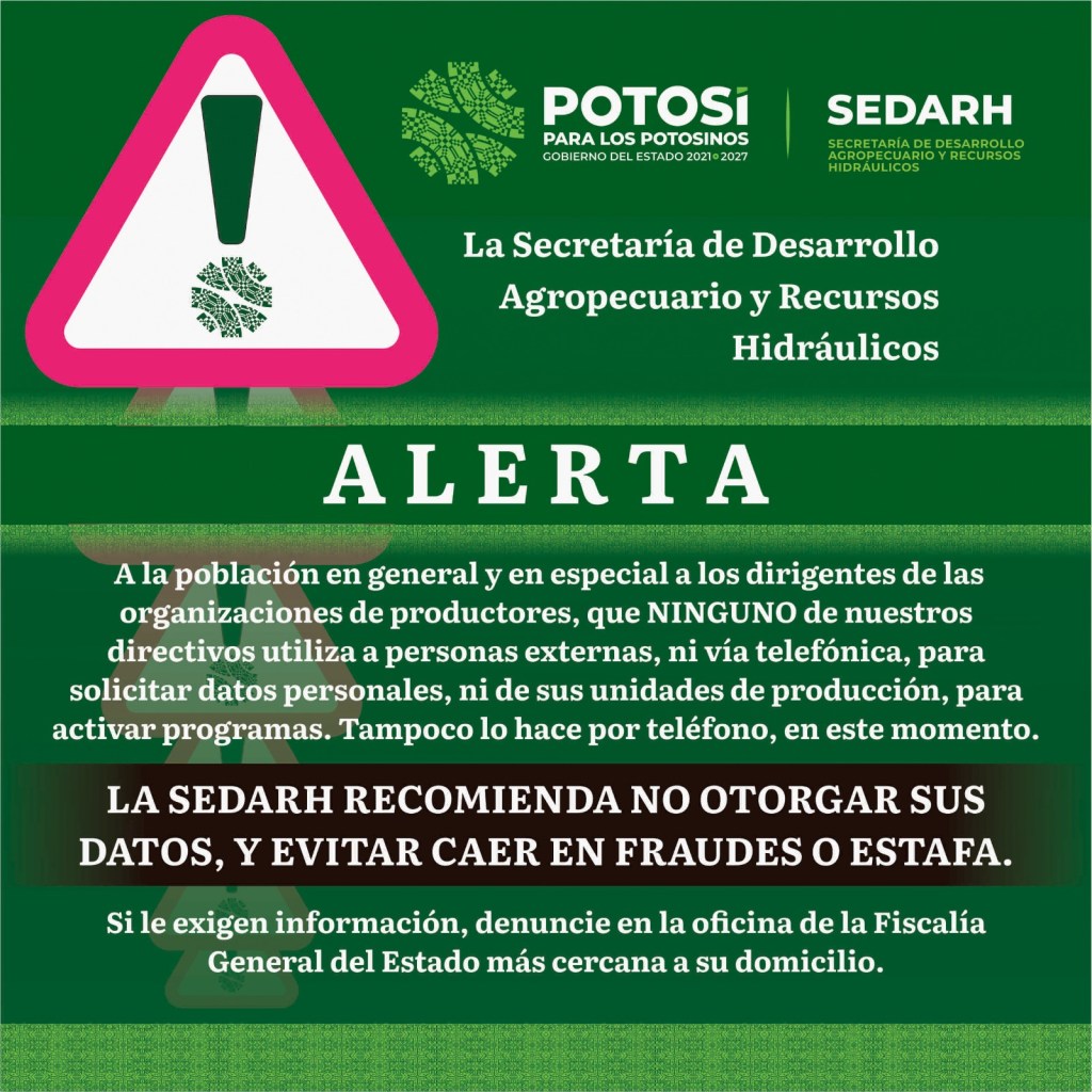 La Secretaría de Desarrollo Agropecuario y Recursos Hidráulicos (Sedarh), hizo un llamado a las y los productores del campo potosino para que no caigan en engaños, ante los recientes casos de llamadas fraudulentas a nombre de funcionarios estatales.