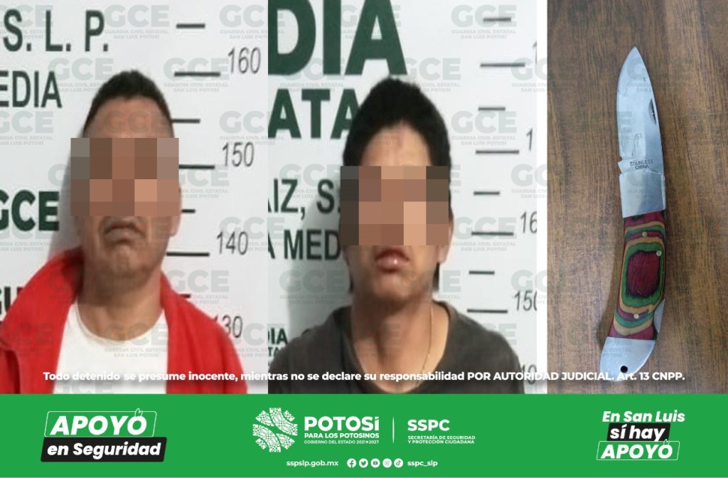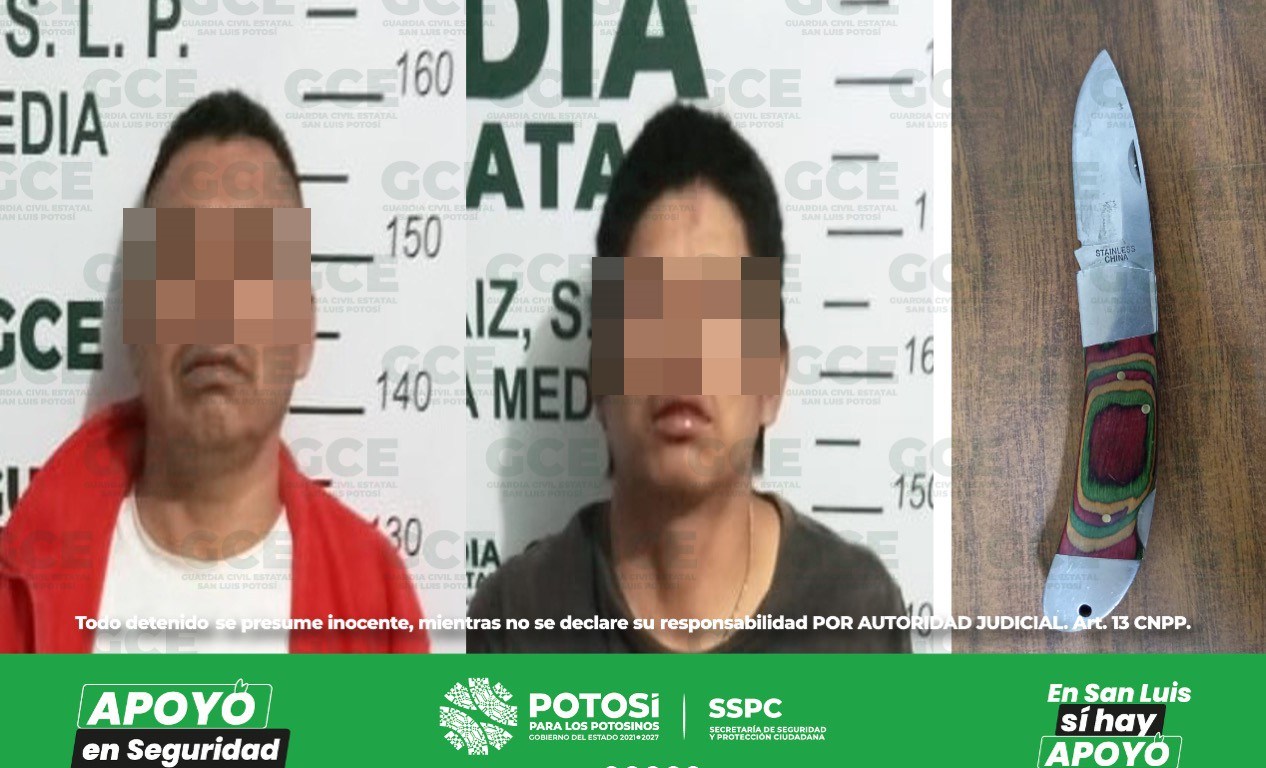 Labores de prevención efectuadas en la carretera 80, en el tramo El Huizache-Ciudad del Maíz, culminaron con la detención de dos hombres, por parte de la Guardia Civil Estatal (GCE) luego de que dichas personas trataran de impedir la labor policial y atentaran contra su integridad; al momento de su arresto se les aseguró una navaja.