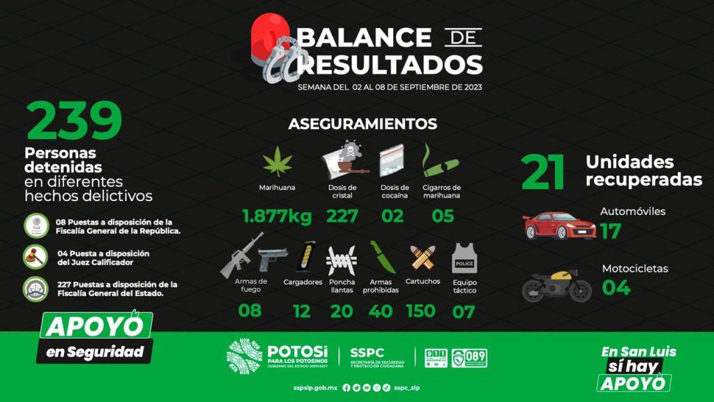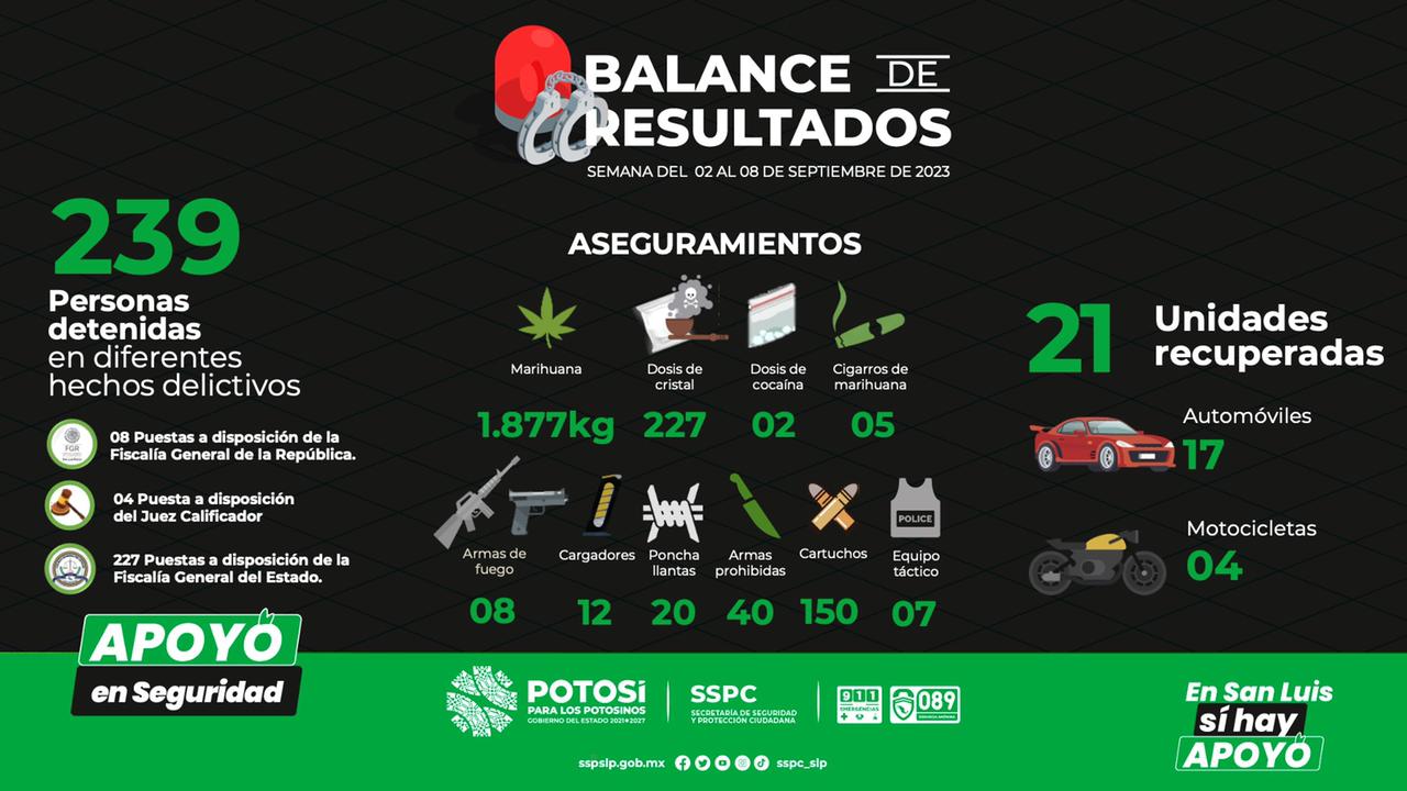 EN LA PRIMERA SEMANA DE SEPTIEMBRE, SECRETARÍA ESTATAL DE SEGURIDAD REPORTA 239 DETENCIONES