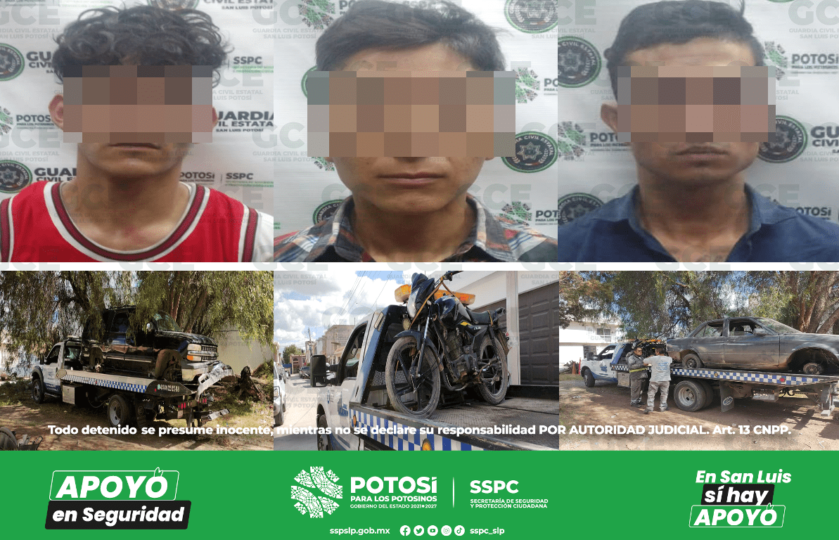 Tras el seguimiento puntual de una presunta banda criminal, dedicada al robo de vehículos en la entidad potosina, oficiales de la Guardia Civil Estatal (GCE), lograron desarticularla después de ubicar a dichas personas mientras desvalijaban dos vehículos que contaban con reporte de robo.