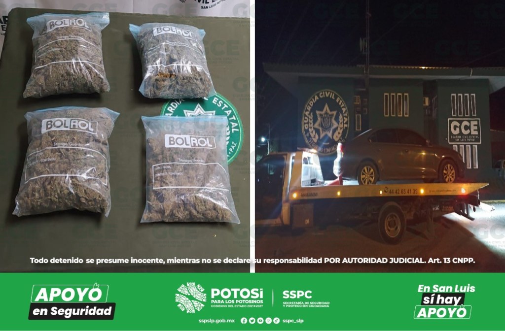 Matehuala, S.L.P.- Dispositivos de seguridad efectuados en el operativo “Altiplano Seguro” por agentes de la Guardia Civil Estatal (GCE), permitieron la localización de un automotor que contaba con reporte de robo en donde se aseguró más de un kilo de marihuana.